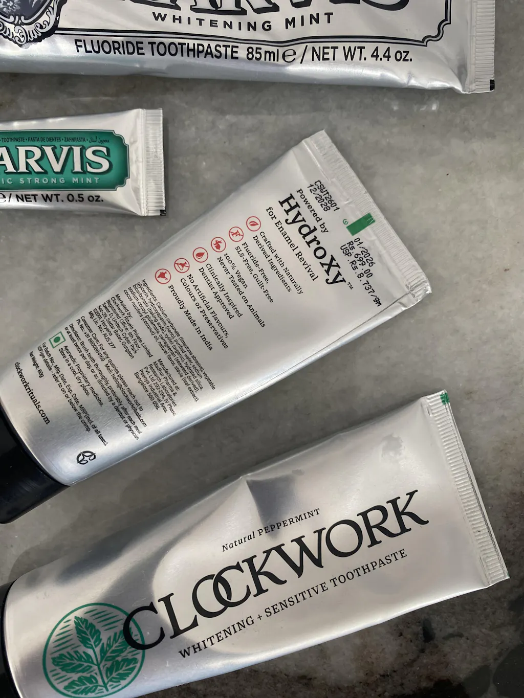 Apply a pea-sized amount of Clockwork Toothpaste to your brush. Clean teeth and gums in slow, circular motions for a full 2 minutes. Rinse thoroughly and enjoy long-lasting freshness. For optimal oral health, repeat twice daily—morning and evening—as part of your daily care ritual.
